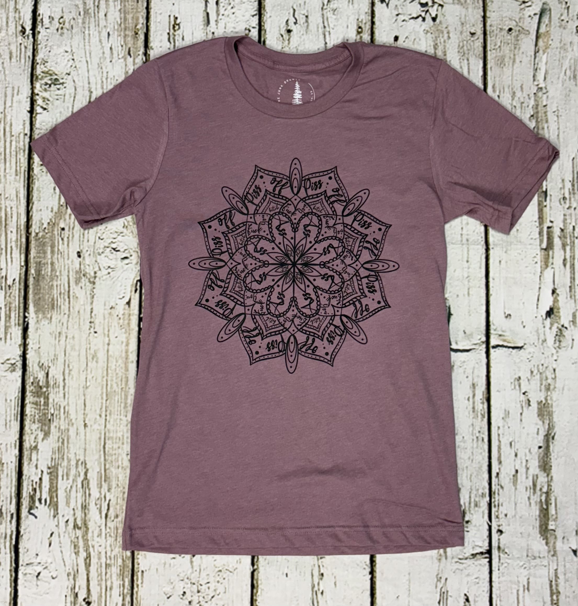Printed on a heathered tan, unisex sizing, cotton/poly blend tee.