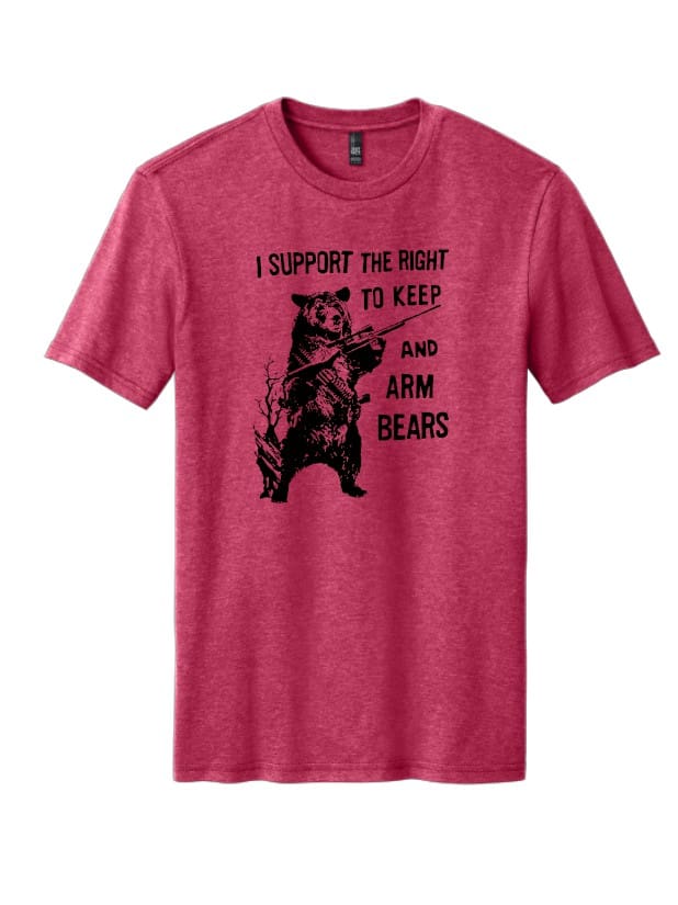 Printed on a light grey heather cotton/poly blend tee.