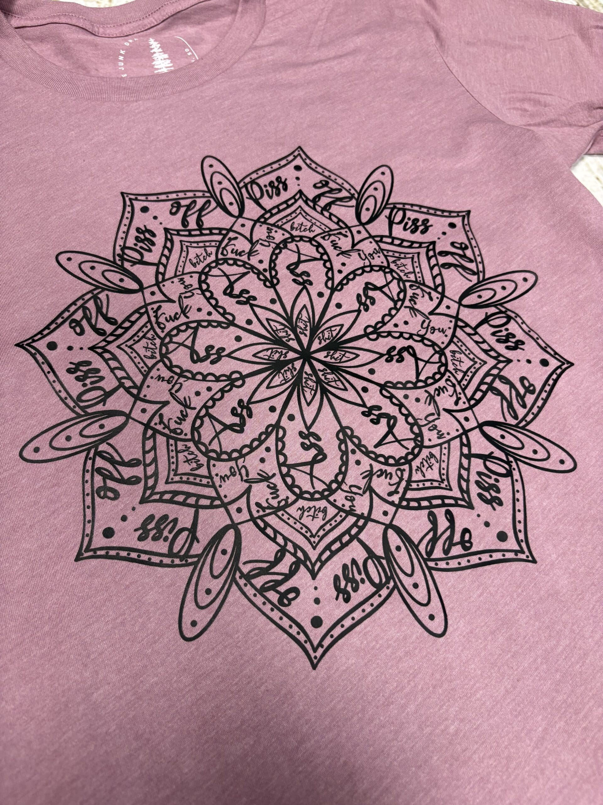 Printed on a heathered mauve, unisex sizing, cotton/poly blend tee.
