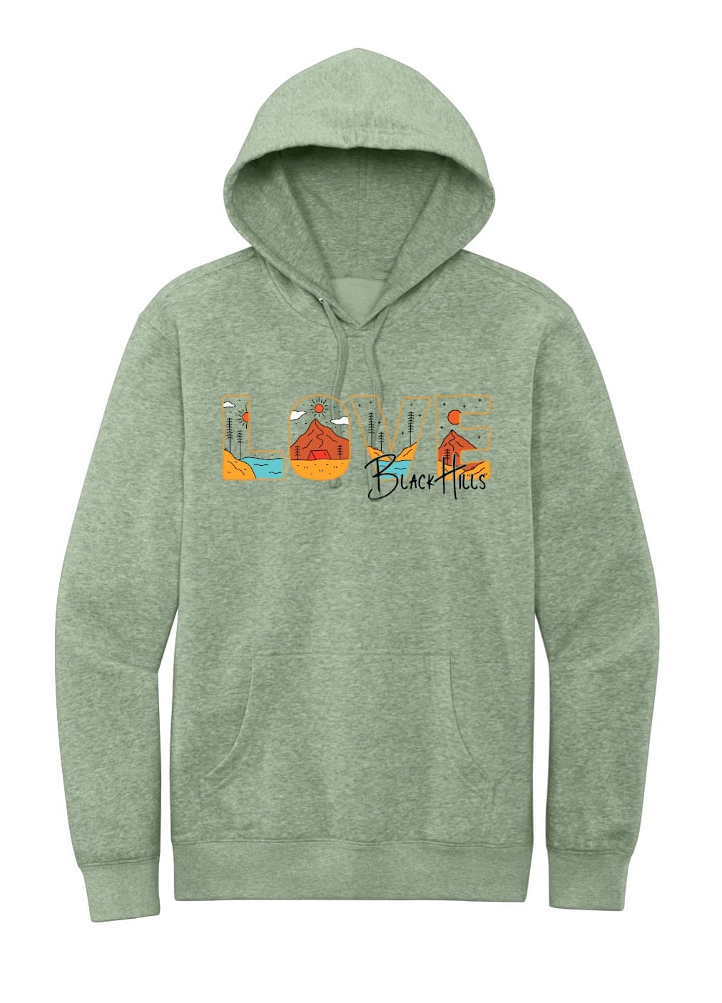 Printed on a heathered dusty sage cotton/poly blend hoodie