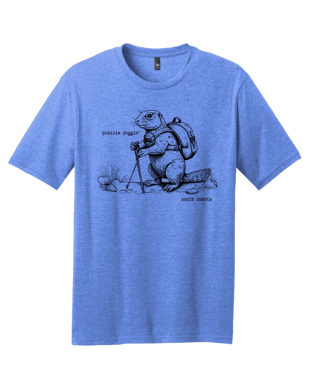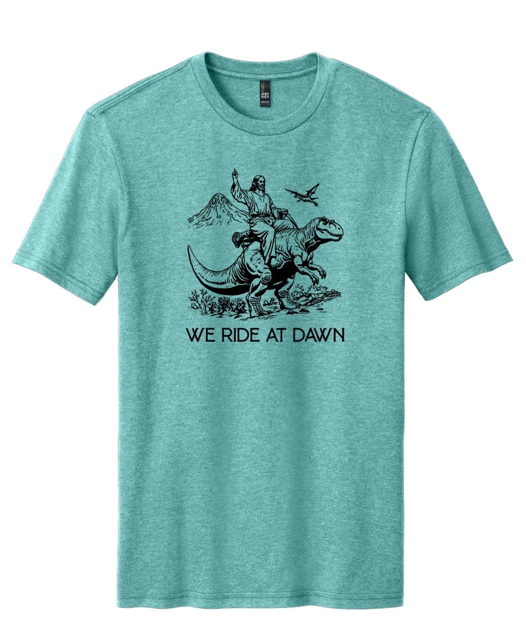 Printed on a heathered eucalyptus blue cotton/poly blend tee