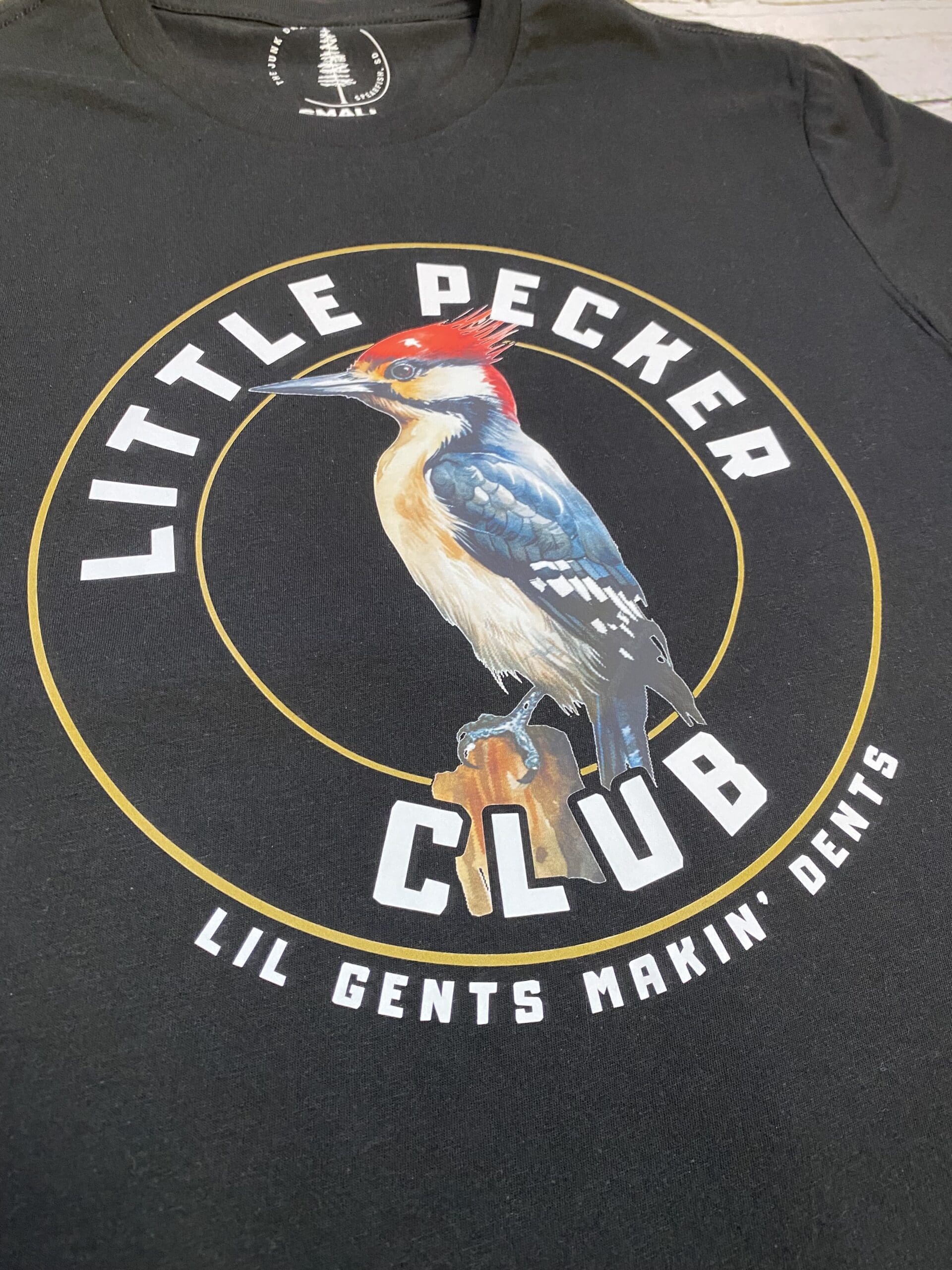 Printed on a black, unisex sizing, cotton/poly blend tee.