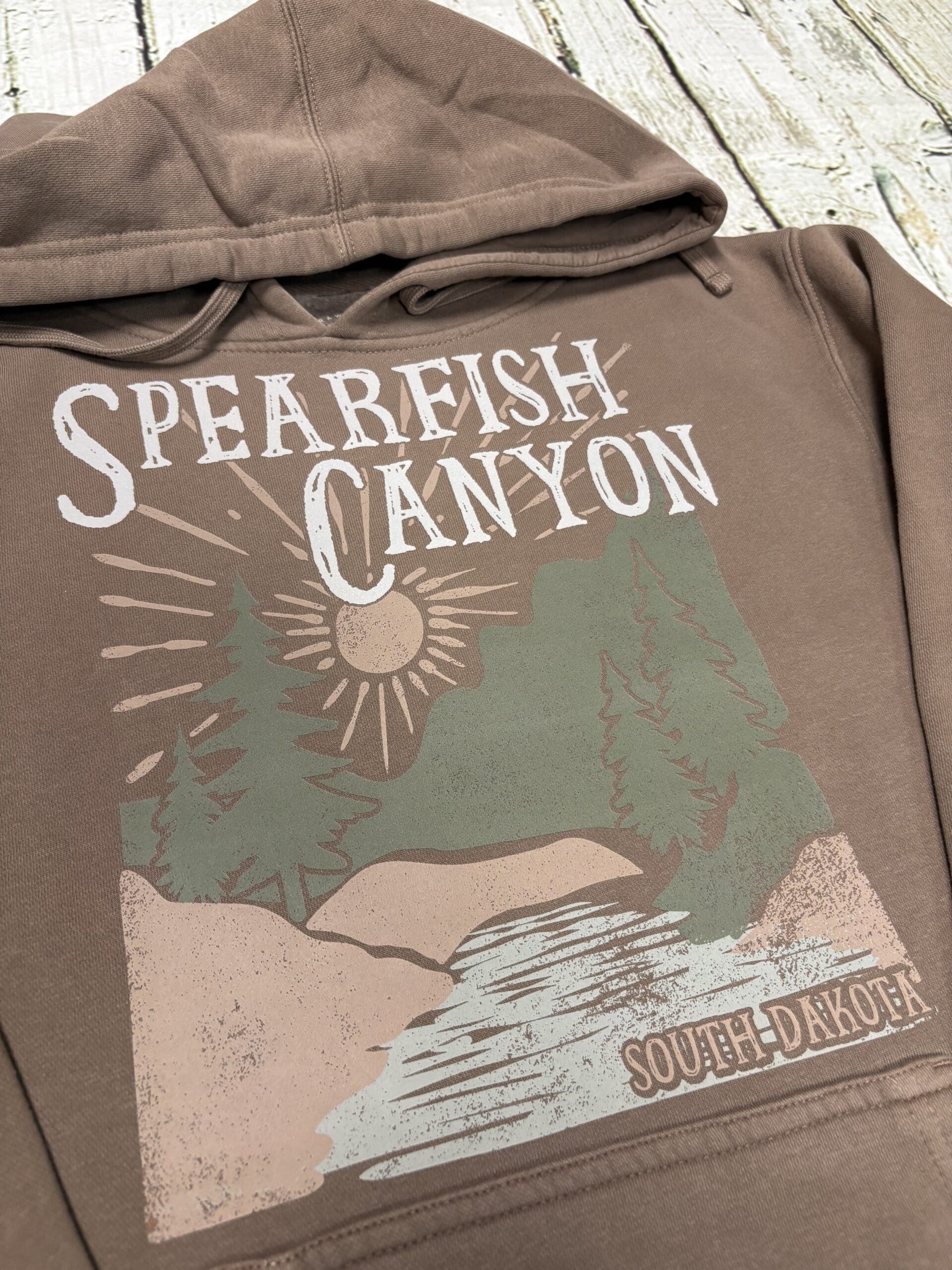 Printed on a pigment clay brown, unisex sizing, cotton/poly blend hoodie.
