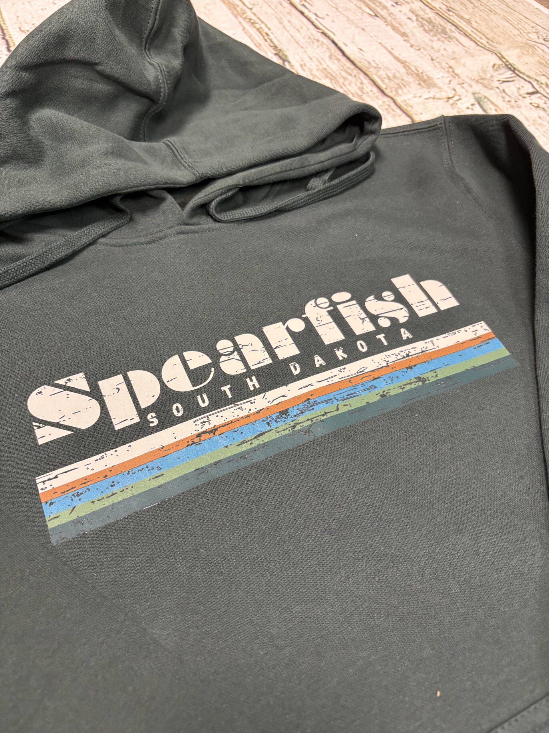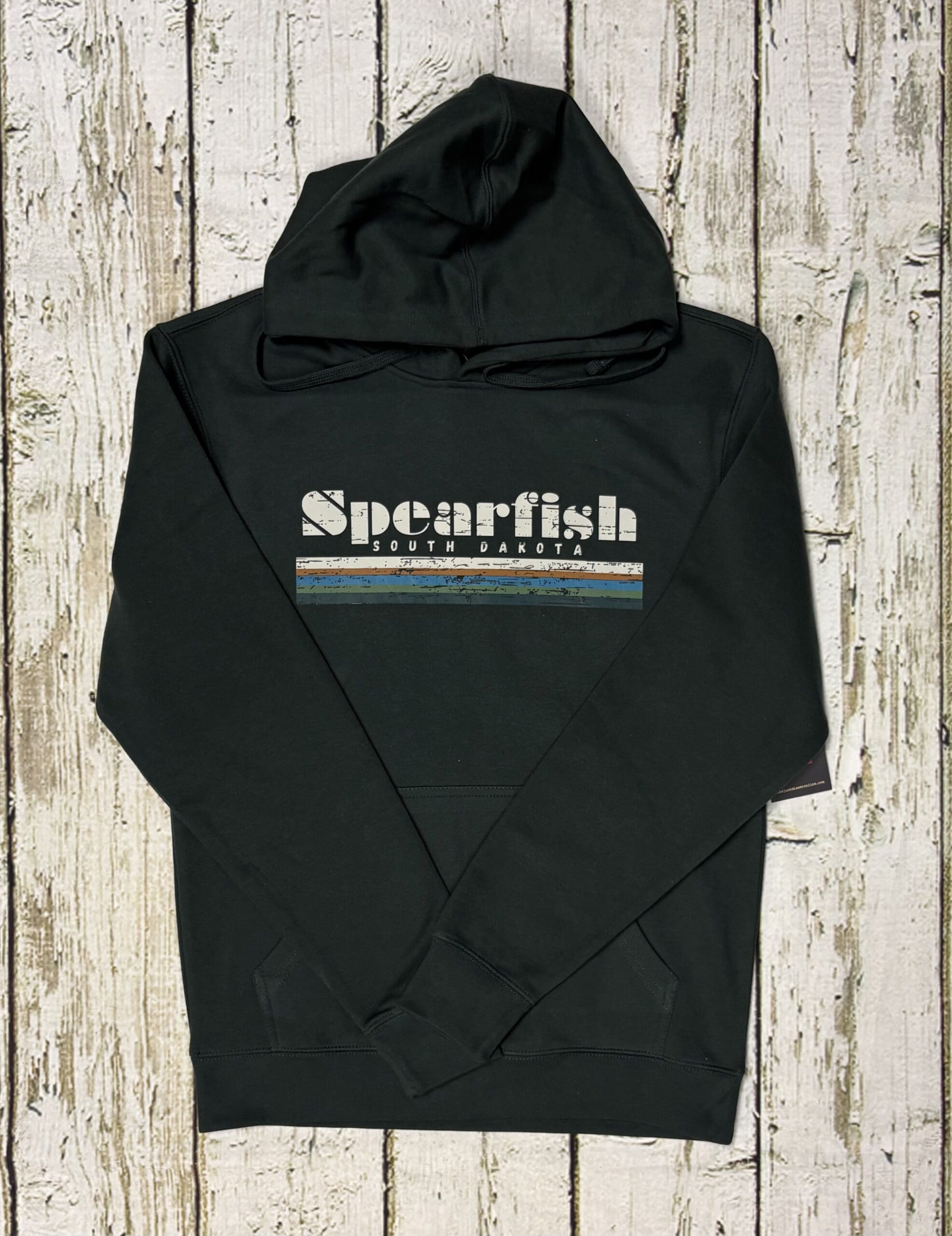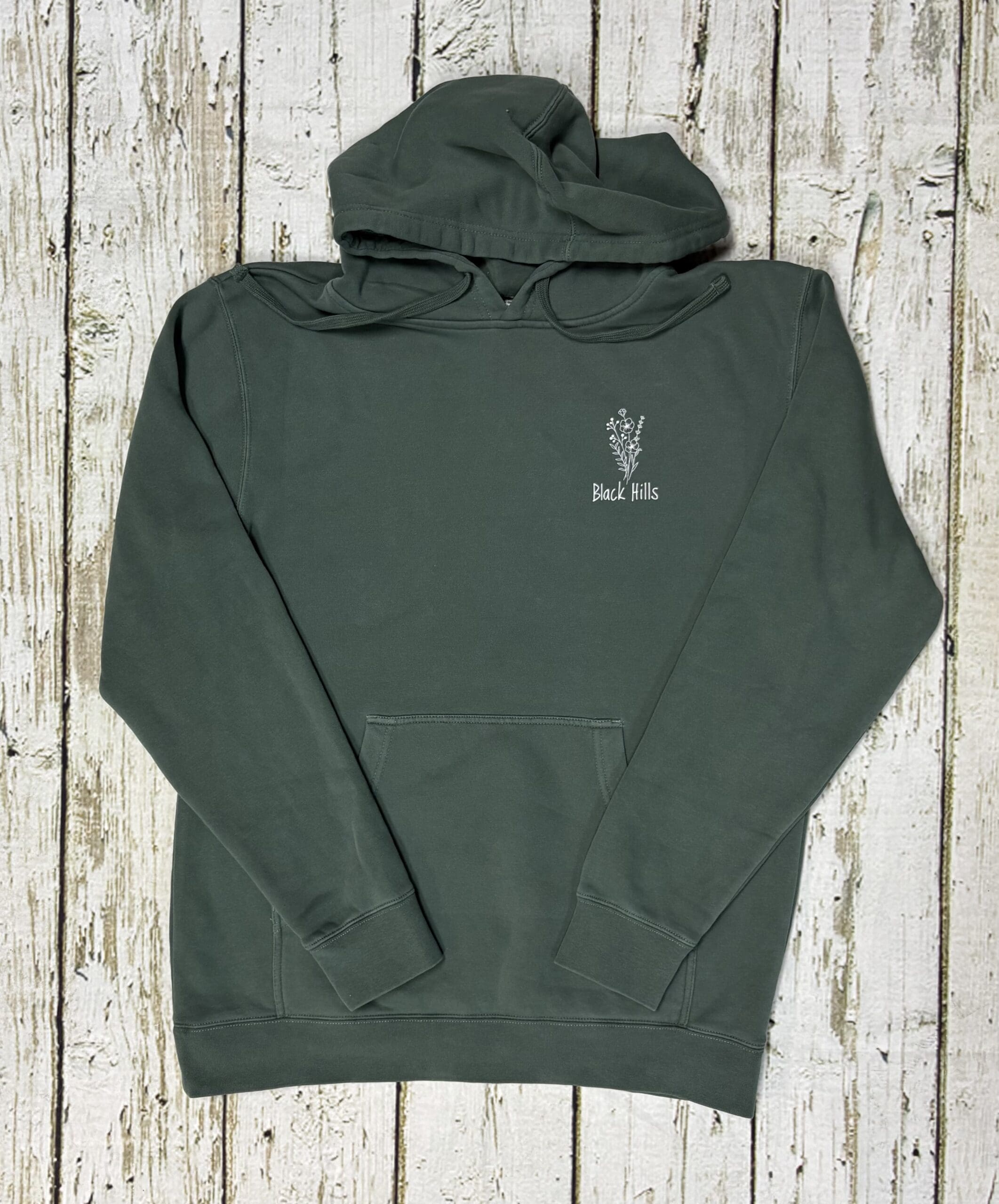 Printed on a forest green, unisex sizing, cotton/poly hoodie.