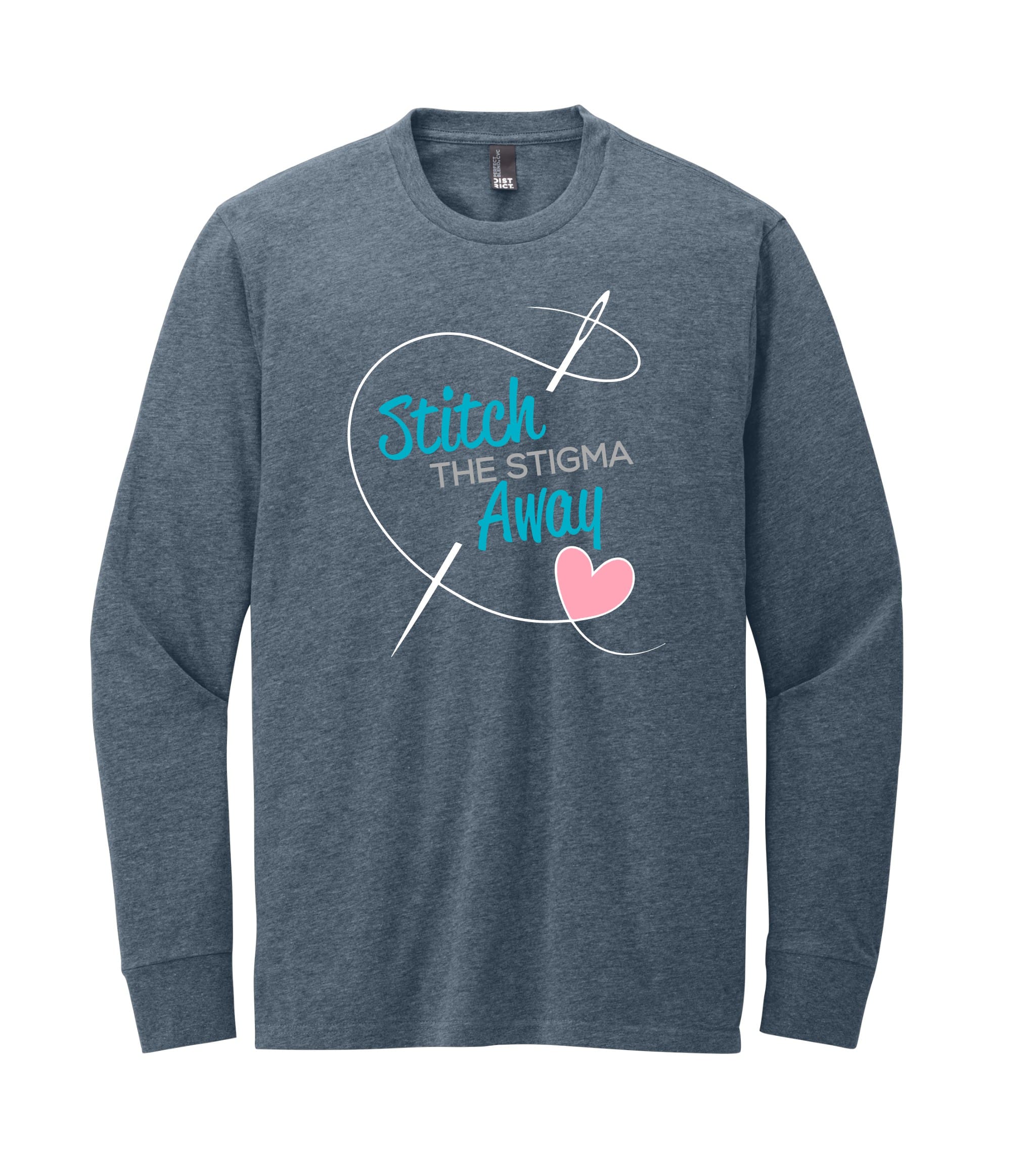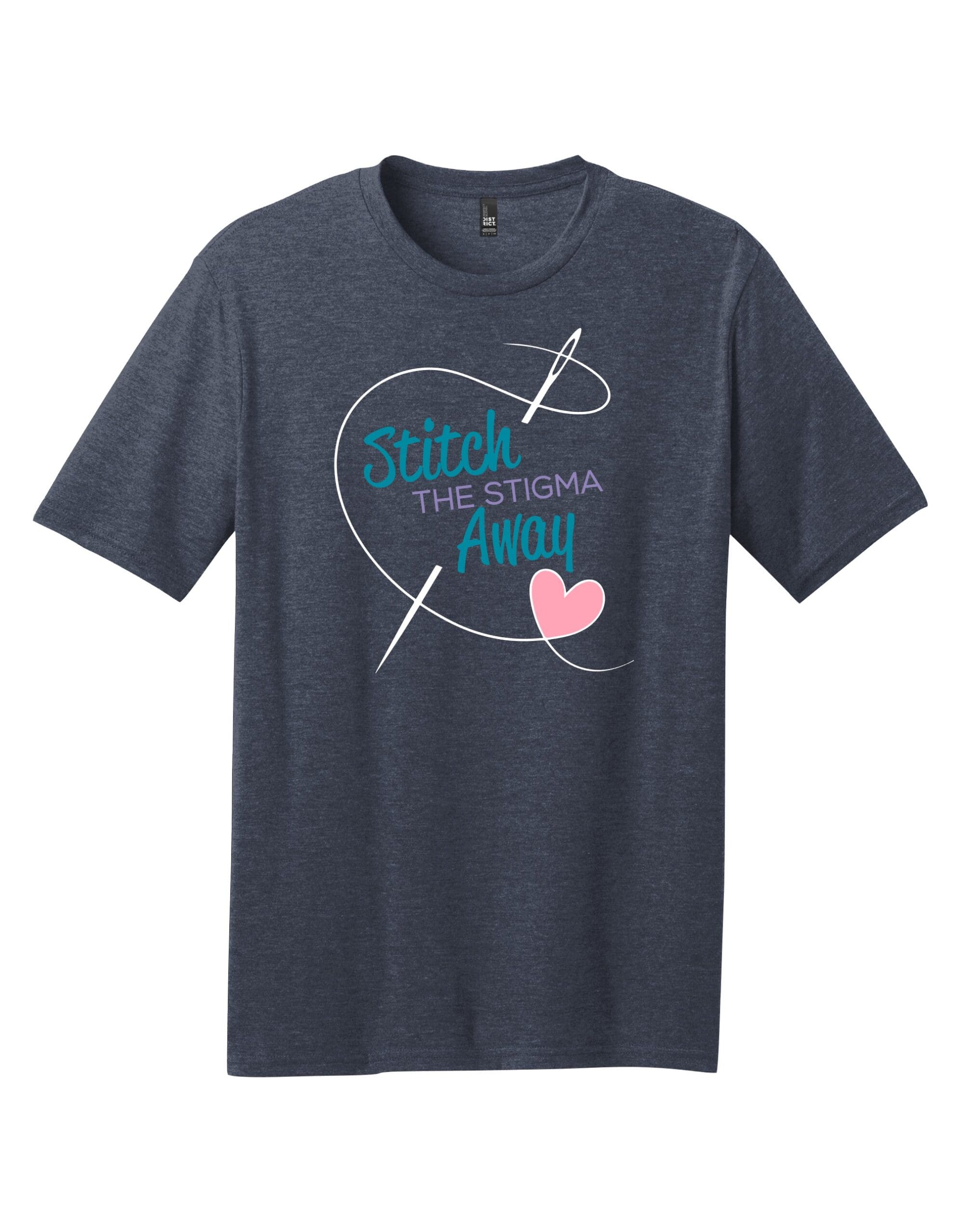 Printed on a heather navy, unisex, cotton/poly blend tee.