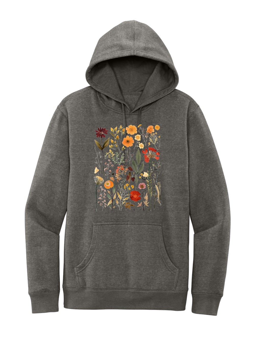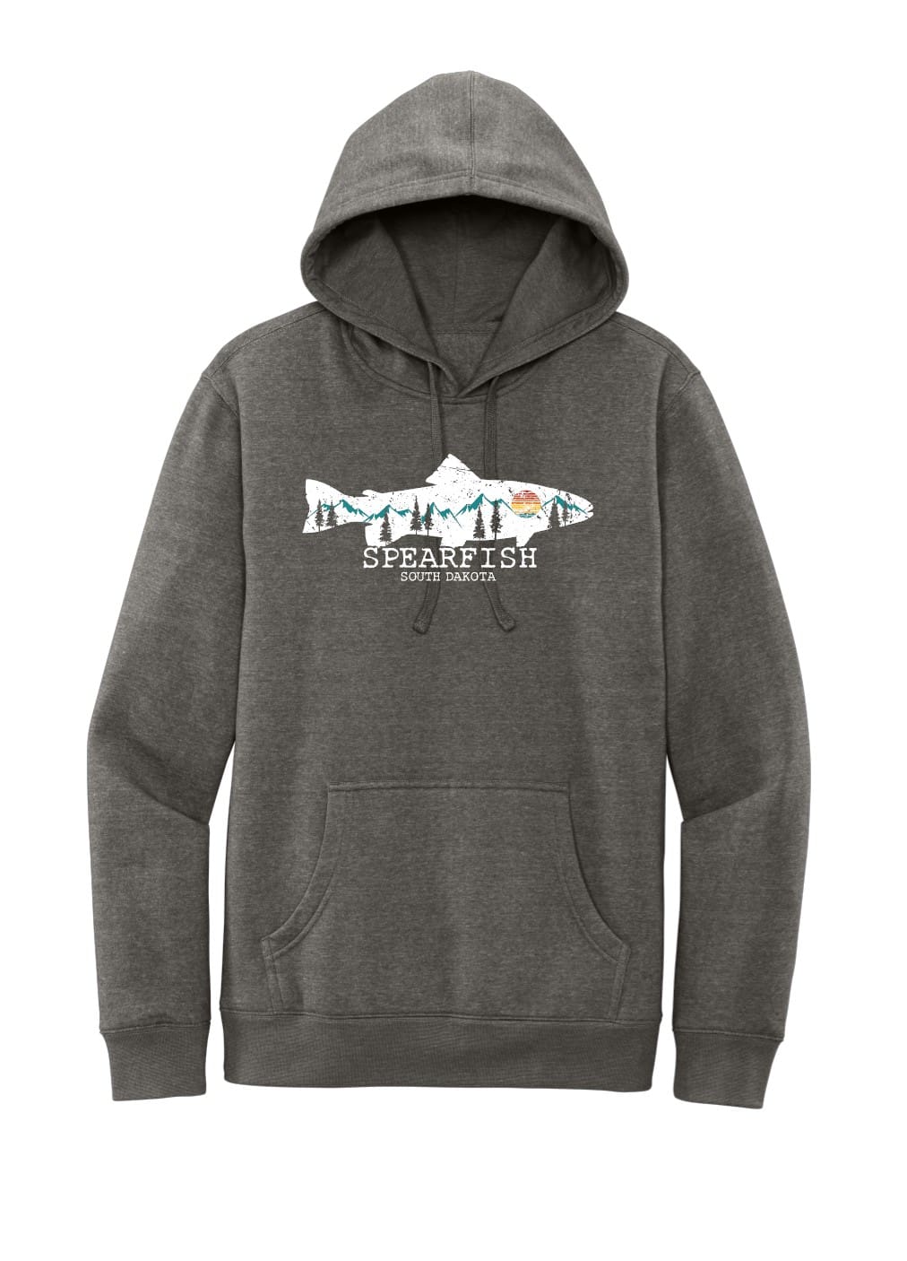 Printed on a heathered grey frost cotton/poly blend hoodie